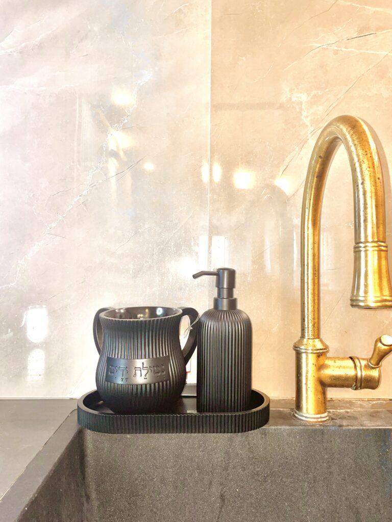 סט תואם סבוניה עם נטלה מיוצר מפולימר, מגיע עם מגש, גוון לבן משופשף עם סגנון עיצוב פסים וכיתוב ׳נטילת ידיים׳.